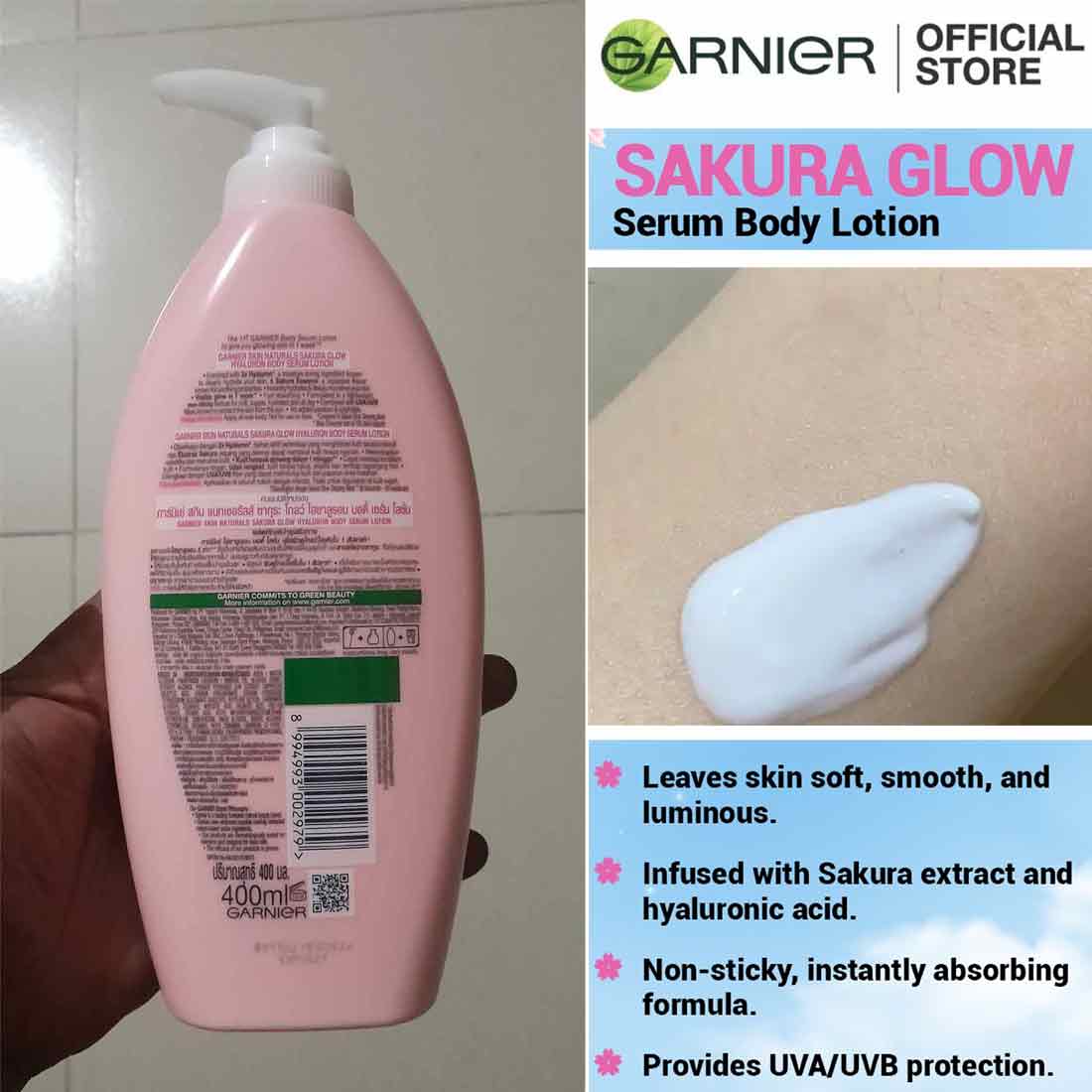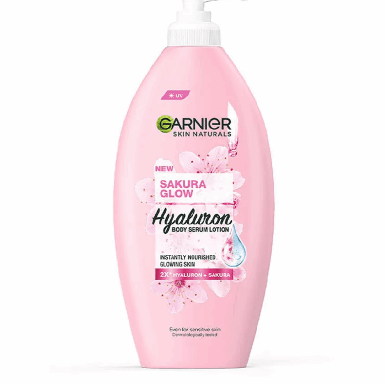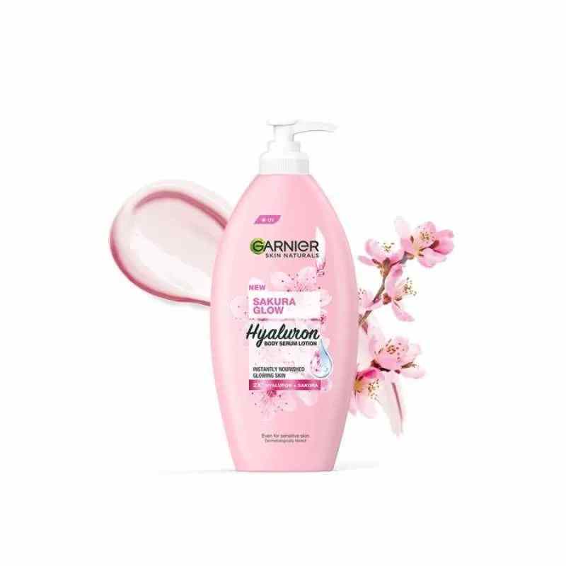 Garnier Sakura Glow Hyaluron Body Serum Lotion 400ml is a brightening and hydrating body serum designed to transform your skin. Infused with Sakura Essence and Hyaluronic Acid, this lightweight lotion glides on smoothly, absorbs quickly, and locks in moisture for plump, soft, and radiant skin. With UVA/UVB filters, it also protects your skin from sun damage, preventing dark spots and premature aging. Suitable for daily use on all skin types, this serum ensures skin stays soft, smooth, and glowing every day.