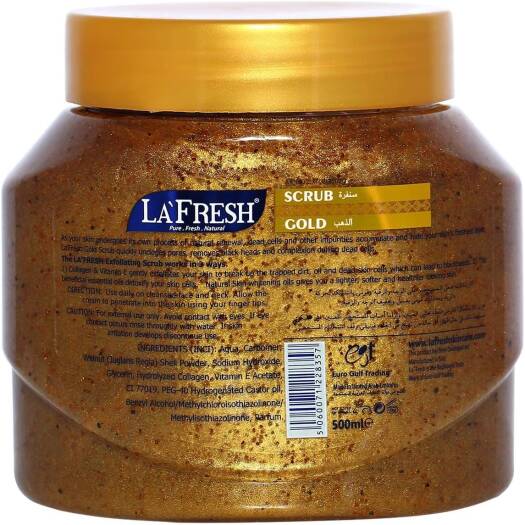 Reveal smoother, softer, and naturally radiant skin with La ’Fresh Gold Scrub. This luxurious scrub combines natural walnut shell powder with gold particles, collagen, and vitamin E to gently exfoliate dead skin cells, unclog pores, and remove impurities. Its advanced formula improves skin elasticity, reduces visible wrinkles, and strengthens the skin barrier. Enriched with essential oils, it detoxifies, brightens, and leaves your skin glowing, lighter, and healthier-looking after every use.