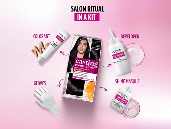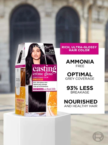 Achieve rich, glossy black hair with L’Oréal Casting Cream Gloss Hair Color Deep Black 200 – a semi-permanent, ammonia-free hair dye perfect for first-time color users. This low-commitment hair color provides natural-looking coverage for grey hairs while leaving hair soft, silky, and full of shine.