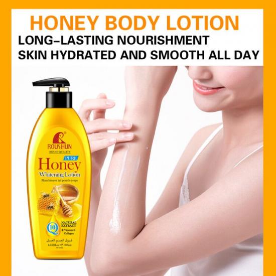 Roushun Honey Whitening Lotion 400ml is a nourishing body lotion enriched with natural honey extract and Vitamin E, specially formulated to brighten, soften, and hydrate your skin. Honey, known for its natural healing and moisturizing properties, helps lock in moisture and enhance your skin’s natural glow. This lightweight lotion absorbs quickly without leaving a greasy feel, making your skin smooth, radiant, and visibly brighter with daily use. Perfect for all skin types, it also helps to improve uneven skin tone and restore youthful elasticity.