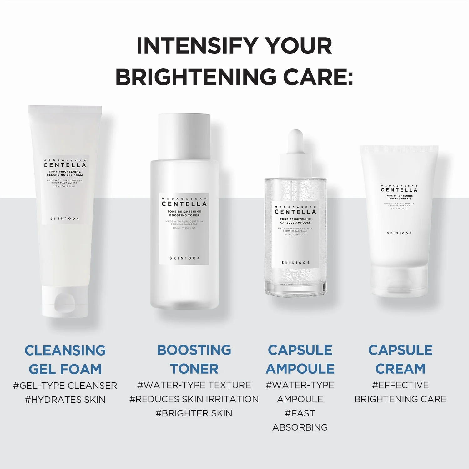 Madagascar Centella Asiatica Extract, Niacinamide, Hyaluronic Acid, brightening capsules, Panthenol, and skin-soothing botanical extracts.