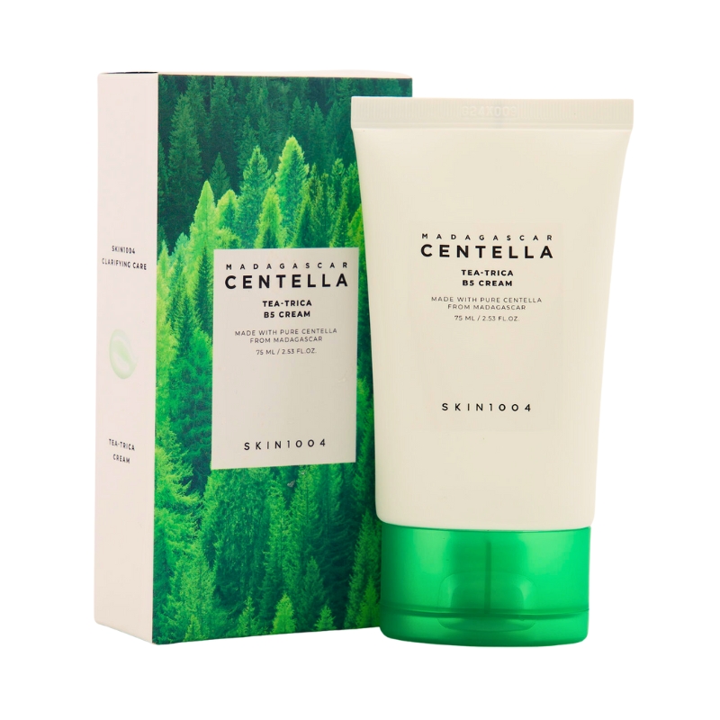 SKIN1004 Centella Tea-Trica B5 Cream is a soothing and hydrating moisturizer specially formulated for acne-prone and sensitive skin. Enriched with Madagascar Centella Asiatica Extract, Tea Tree ingredients, and Vitamin B5 (Panthenol), this cream helps calm irritation, control excess oil, and support skin recovery. Its lightweight yet nourishing formula hydrates the skin while strengthening the skin barrier, leaving the complexion clearer, smoother, and healthier.